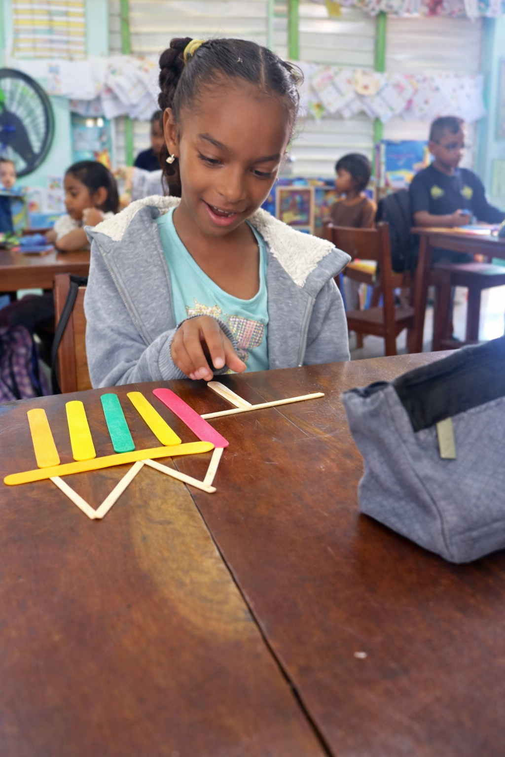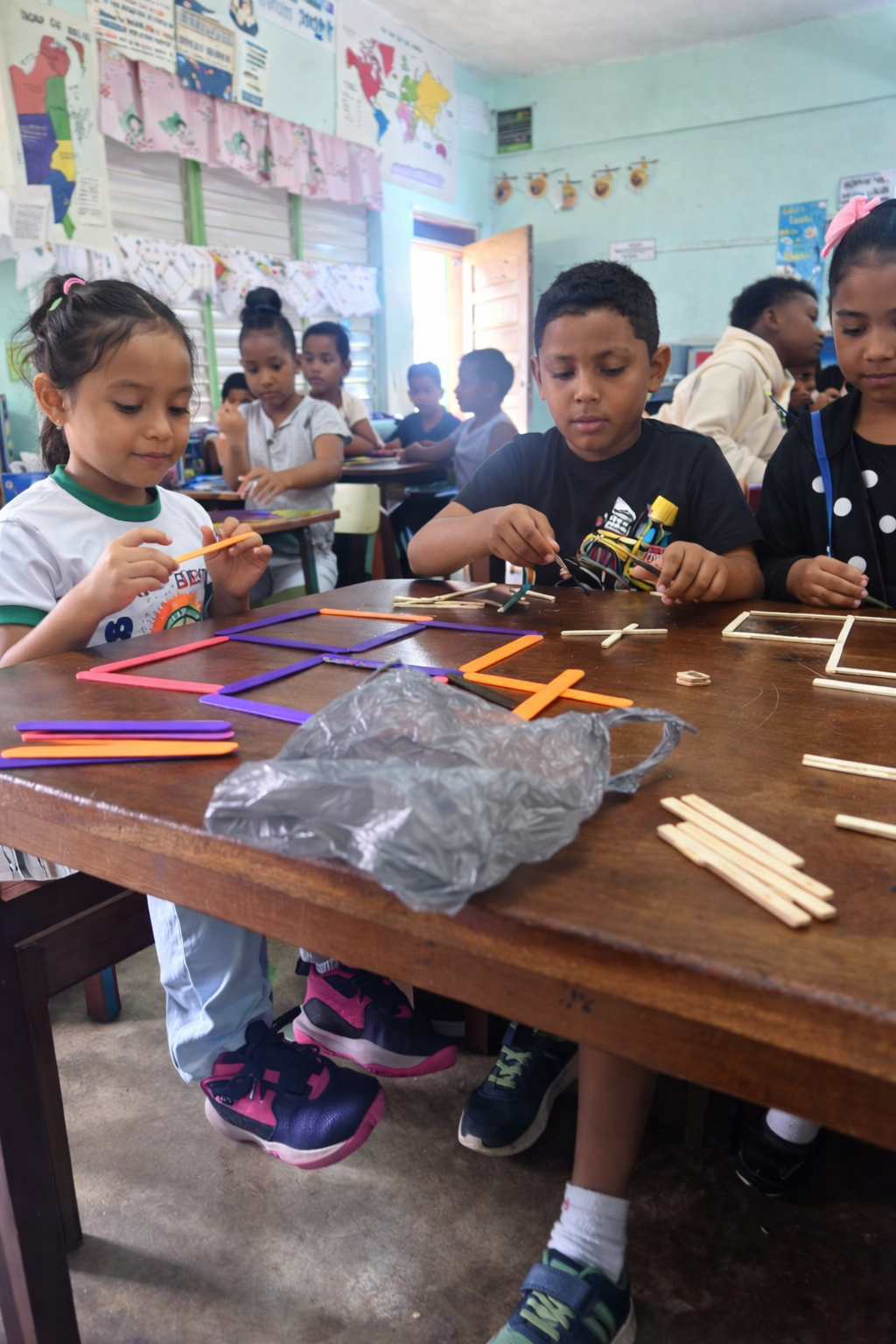 Using popsicle sticks, they carefully designed and constructed houses, churches, and beautiful garden scenes. As they worked, students discussed the shapes they were using, counted sides and corners, and explained how their designs were made up of two or more shapes joined together. The activity strengthened not only their mathematical understanding, but also their fine motor skills, collaboration, and confidence.